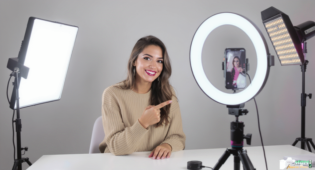 Un ring light 10-12″ avec trépied et support smartphone : simple, uniforme, idéal face-cam/maquillage. Évoluez ensuite vers un panneau/COB pour un modelé plus naturel et setup 2-3 points.